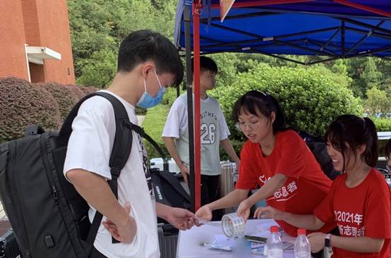 11日上午,灼灼烈日下处处可见志愿者的身影,他们身着迎新标语志愿服,或是高高举着迎新标牌,或是静静守候在服务位点,或是弯下腰从车上搬下一箱箱行李,为新生指引宿舍的方向。移交物资,搬运物资……志愿者们汗流浃背,事无巨细,身体力行的为新生们做一件件暖心事。