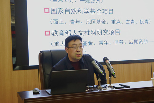 会上,祝树金教授作了题为《国家基金项目申报——数据分析及撰写建议》主题报告,介绍了国家、教育部项目申报类别及立项的总体情况,剖析了2021年科研项目热点主题,从如何选好题、如何破解课题设计论证等方面详细讲解了国家社会科学基金项目申报书的撰写要点,并从积累、分析、打磨、交流、指导等维度提出了具体建议。