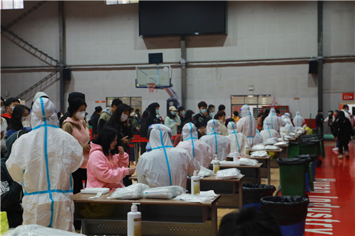 新冠疫情防控领导小组办公室于3月19日晚向全校发布紧急全员核酸检测通知,20日一早统筹调度后勤处、体育艺术部、校团委、保卫处、丹田物业公司等部门,在训练馆内快速布置18个检测台。学士街道斑马塘社区及学士街道卫生服务中心派出20余名医护人员进驻我校支持开展采样工作。