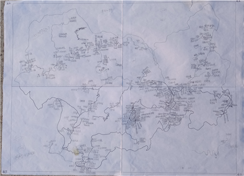 有的组在山坳,有的组在山坡,彭海斌每走一段路就在图上描一段,哪儿拐弯,哪儿直行都在图上表现出来。从9张局部图到最后青艾村的整体图,彭海斌花了近2个月的时间。