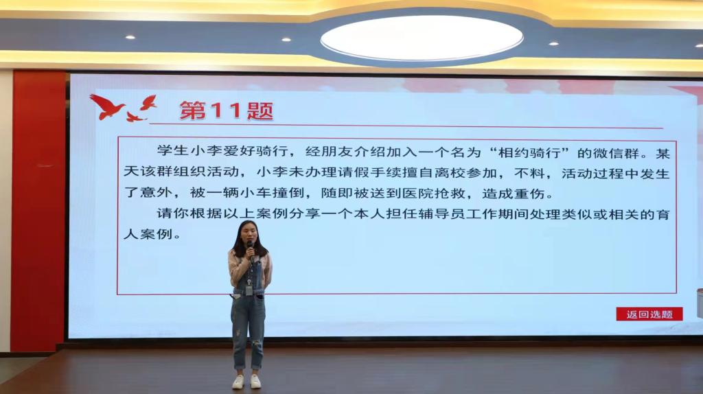 描述定位环节主要考察我校辅导员对所带学生基本情况的熟悉程度,在此之前,每位辅导员在测试系统已提交100名所带学生的基本信息,比赛现场随机抽选5位学生进行信息识别。与往届不同的是育人案例分享环节,辅导员上场前8分钟抽选一个育人案例题目,然后结合自身工作实际,分享一个工作期间处理类似或相关的育人案例。该环节从多个维度考察辅导员对学生成长成才规律的了解把握程度、对学生的教育引导能力以及解决实际问题能力。