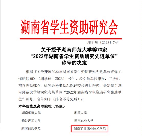本网讯 近日,湖南省学生资助研究会2022年年会在湖南湘潭召开,会议对2022年全省学生资助工作进行了总结表彰。经研究会评定,我校获评2022年湖南省学生资助研究先进单位,这是我校连续第7年获此殊荣。