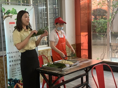 食堂工作人员向留学生介绍了端午节的历史和习俗,并演示了包粽子的方法,“把两片粽叶交错叠放,对折成圆锥形的斗,将糯米和馅料放进斗里,再把粽叶下折封住斗口,最后用棉线拦腰捆绑住。”在食堂工作人员细致讲解下,在场师生兴致勃勃,纷纷拿起手中的粽叶边学边包,一展身手。