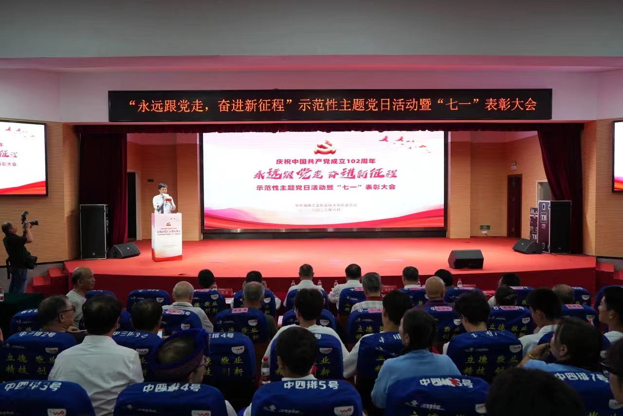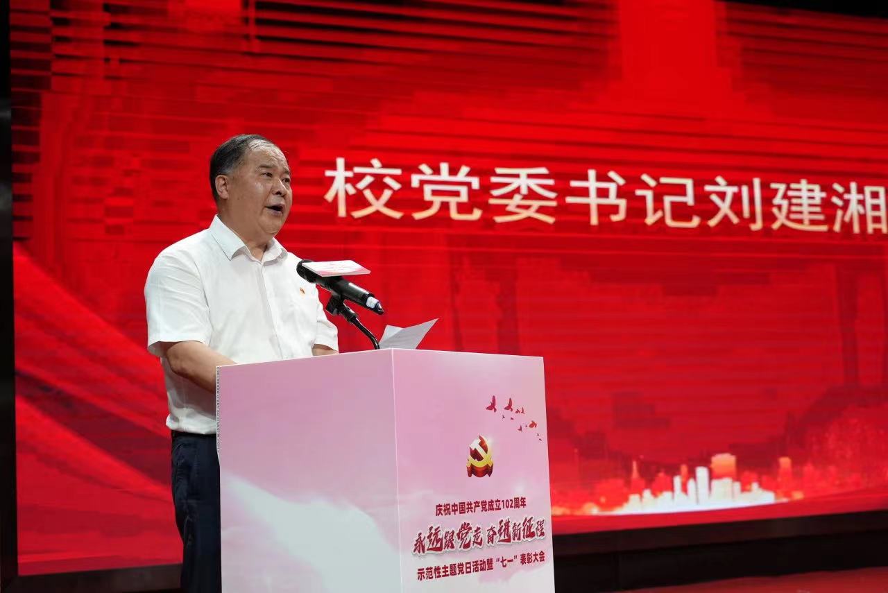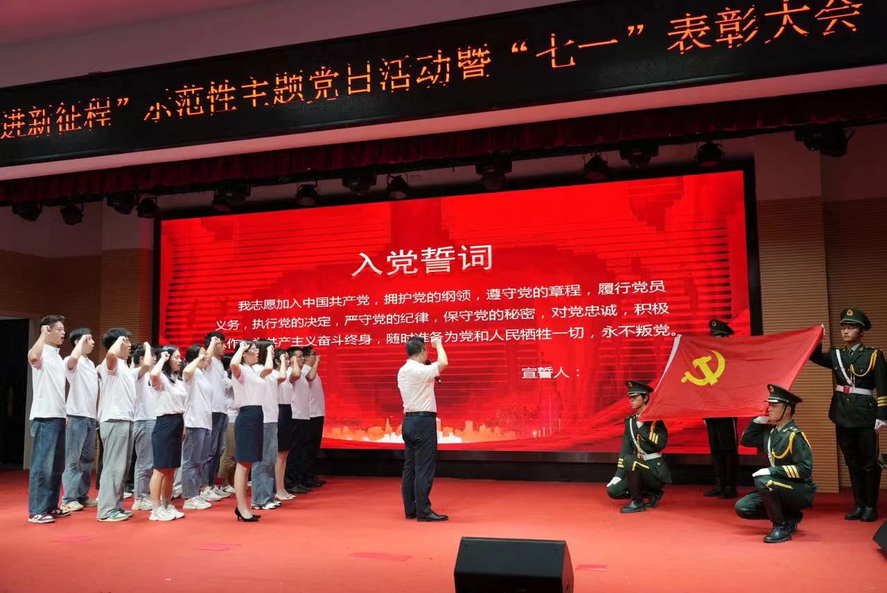 本网讯 “两优一先”VCR播放、微党课开讲、优秀党员表彰、新党员入党宣誓、“光荣在党50年”纪念章颁授、歌舞表演……6月30日,我校举行“永远跟党走 奋进新征程”示范性主题党日活动暨“七一”表彰大会,活动现场仪式感满满。