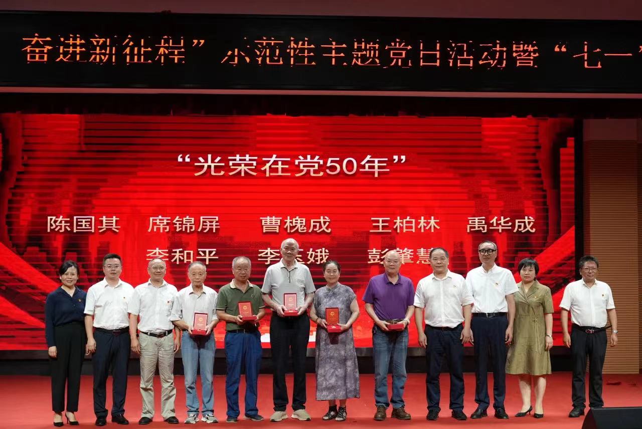 为李和平等8名老党员颁授“光荣在党50年”纪念章。现场39名新党员集体宣誓,全体参会人员合唱《我们走在大路上》。