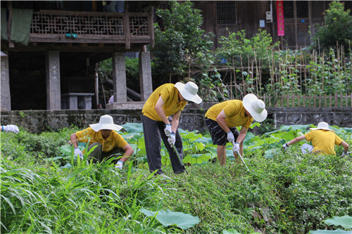 “我们村古寨景点多,为显旅游景观特色,我们在村里的所有荷塘都人工种植了部分花木。”荷塘管理员向队员们介绍,“但由于山里气候湿润,各种花木杂草也长的很快,经常需要清理,今天你们过来帮忙真实省了我们好大功夫”。队员们到池旁时,杂草已布满荷塘小道旁,围绕“土地宝”前后100多米的范围,队员们用镰刀开始进行清整,在松土拔草的同时,大家也沿着荷塘清理垃圾疏通小道。