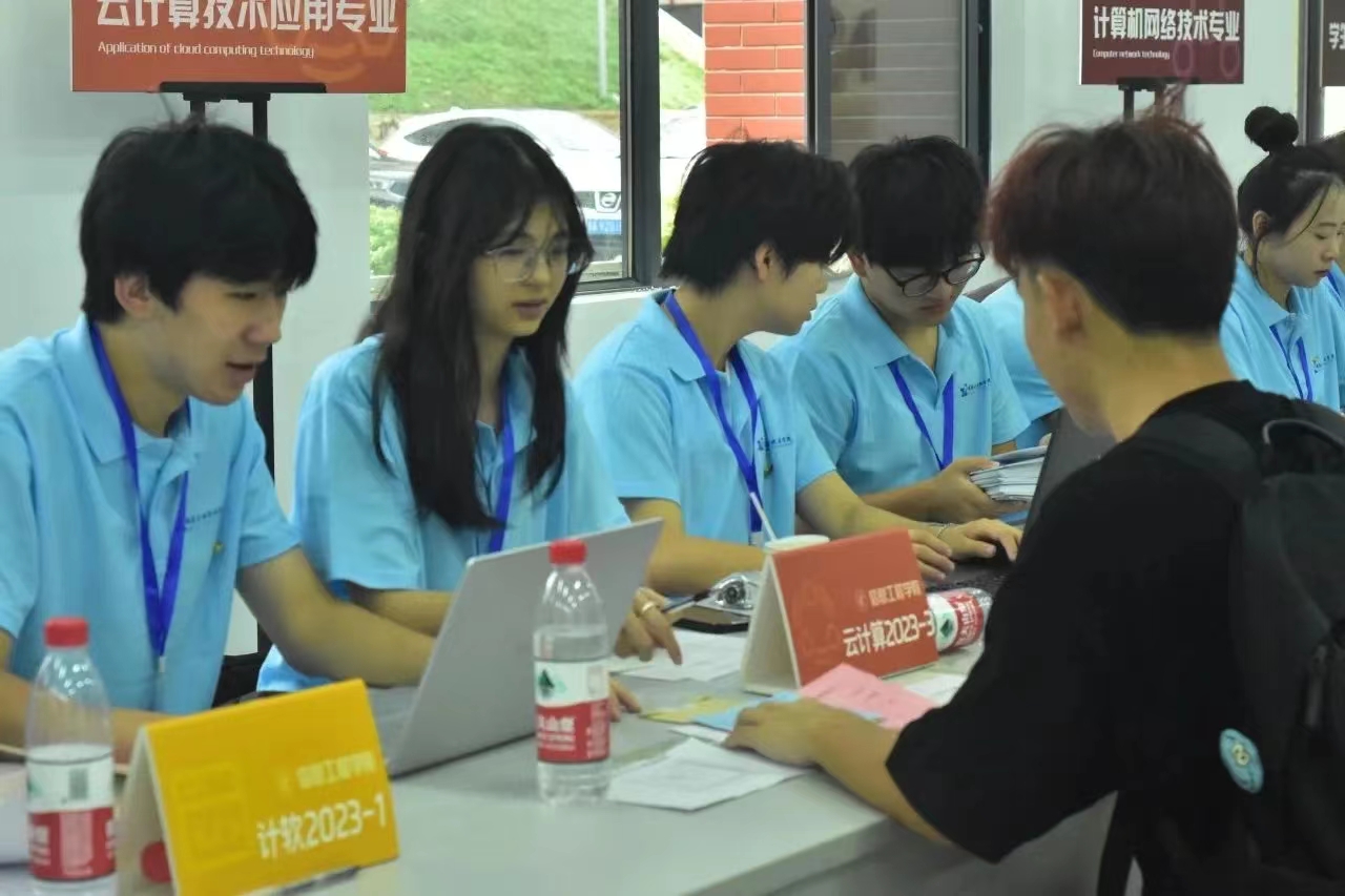 很大,多亏了学姐们热情指导方向,学长帮忙搬运行李。看到道路两旁绿意葱葱,闻到食堂美味的饭菜香气,我在这里感受到了家的温暖。”智装3班的唐毅同学说道。