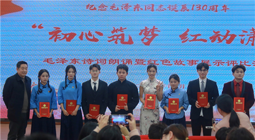 “纪念毛泽东同志诞辰130周年”毛泽东诗词朗诵暨“初心筑梦 红动潇湘”红色故事展示评比活动决赛中,电商2022-4班杨鹏动情的讲述扣人心弦,催人泪下。移应2022-2班彭锦以《一个普通的战士》为题,讲述了毛泽东之子毛岸英英勇加入中国人民志愿军、在抗美援朝战场上光荣牺牲的经历。