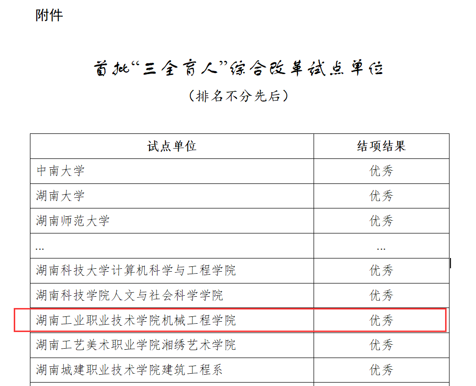 本网讯 1月26日至2月1日,中共湖南省委教育工委、湖南省教育厅对首批“三全育人”综合改革试点单位项目结项结果进行公示。我校机械工程yy漫画“三全育人”改革试点院系验收等级为优秀。