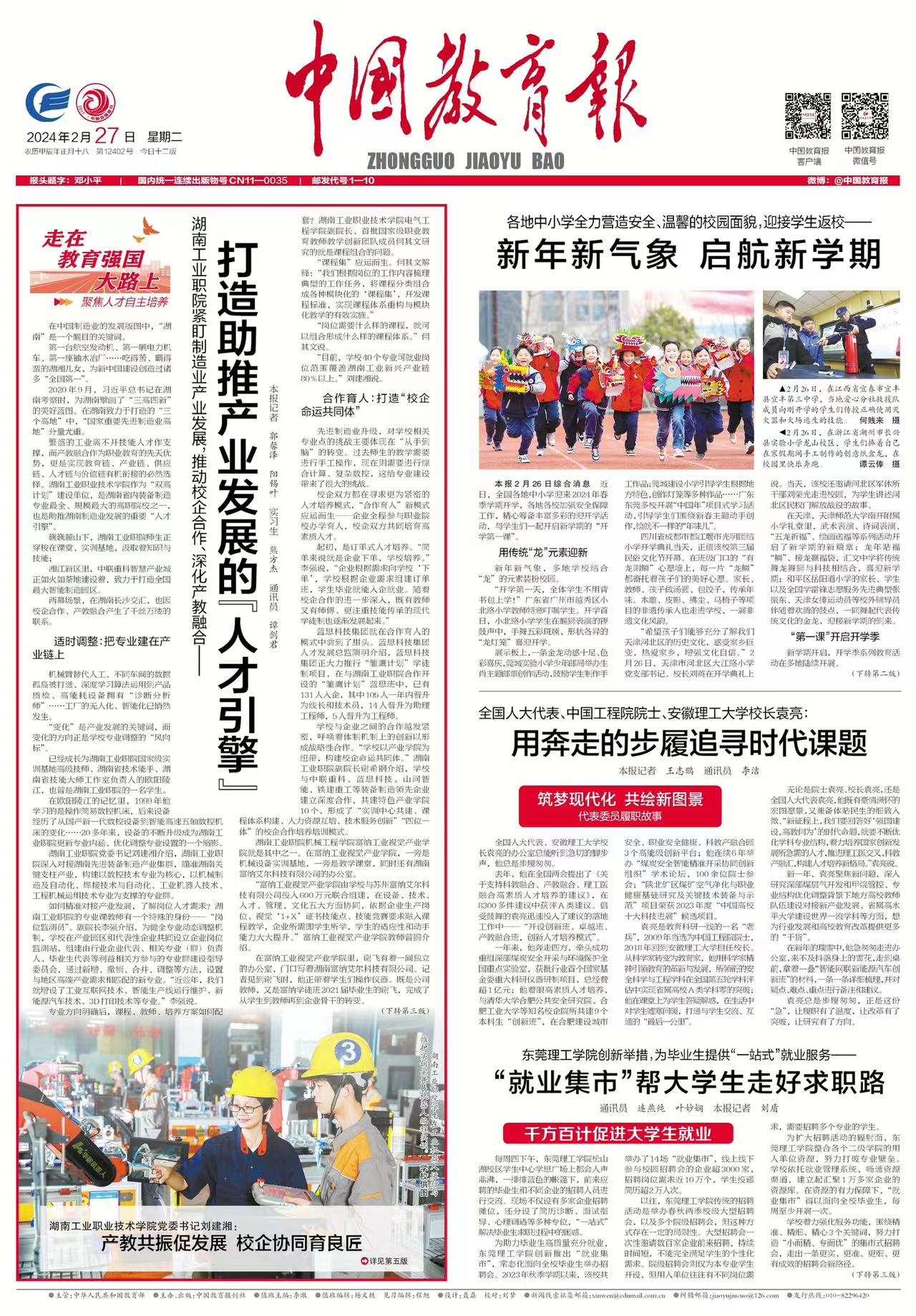 本网讯 2024年2月27日,中国教育报头版“走在教育强国大路上”专栏以《湖南工业职院紧盯制造业产业发展,推动校企合作、深化产教融合——打造助推产业发展的“人才引擎”》为题,从“适时调整:把专业建在产业链上”“合作育人:打造‘校企命运共同体’”“人才支撑:创新研发赋能产业发展”三个方面,专题报道了yy漫画