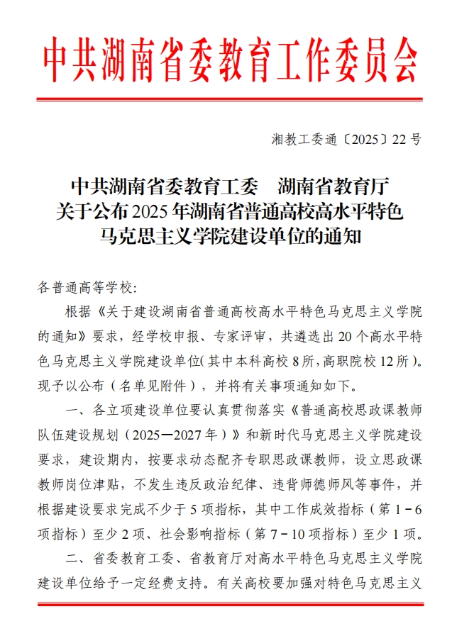 本网讯 近日,省委教育工委、省教育厅联合印发《关于公布2025年湖南省普通高校高水平特色马克思主义yy漫画建设单位的通知》,确定包含我校在内的20所高校为“高水平特色马克思主义yy漫画建设单位”,为yy漫画