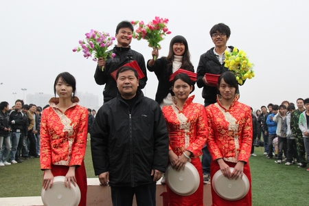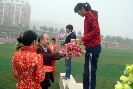 裁判长宣布团体比赛成绩之后,第九届田径运动会颁奖仪式正式开始。经过两天的激烈角逐,此次运动会决出的团体奖项有“优秀方阵代表队”(由汽车工程yy漫画、机械工程系、信息工程系等获得)、“团体总分前三名系代表队”(由机械工程系、经济管理系和汽车工程yy漫画夺得)、“体育道德风尚奖”(由电气工程系夺得)。yy漫画院长刘建湘教授、yy漫画党委副书记周立华、yy漫画调研员刘琼为获奖团体代表颁奖。