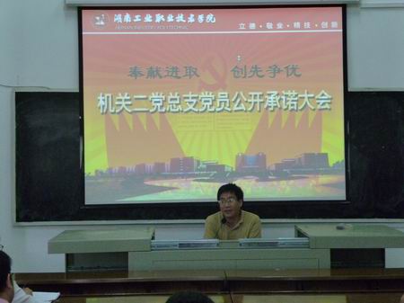 党总支委员谭耀辉代表机关二党总支宣读了2010年党总支的公开承诺,杨学文、谭剑君和周承华等分别代表教务成教党支部、实训鉴定党支部和图书馆党支部宣读了2010年党支部的公开承诺,党员代表周双宣读了个人的公开承诺。