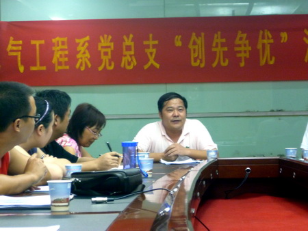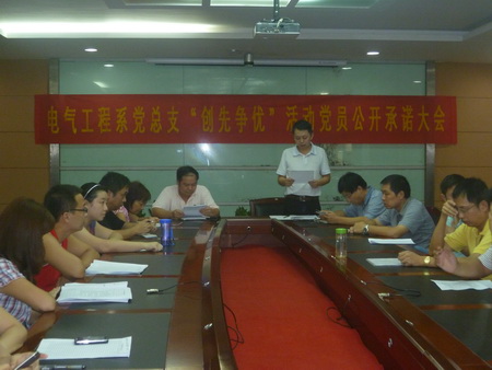 会议由电气工程系党总支副书记王俊主持。王俊在会上通报了电气工程系开展“创先争优”活动的进程安排,同时宣读了电气工程系党总支的公开承诺书。