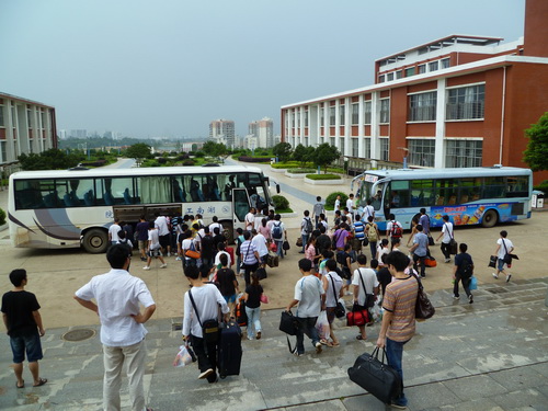 老师们欢送同学们登车
