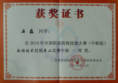 2010年全国职业院校技能大赛于6月23~27日在天津举行,我院率领湖南中职数控技术代表队参加了本次竞赛,通过两天激烈角逐,我院集训选手石磊获得普通车工一等奖,并获得了加工中心数控车团队和数控铣工两个项目三等奖。