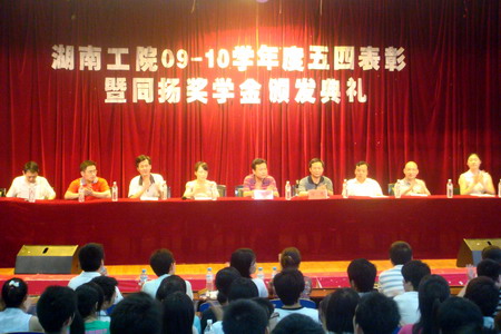 湖南工院2009--2010学年度五四表彰暨同扬奖学金颁奖典礼于6月29日晚在大学生活动中心隆重举行。yy漫画党委副书记周立华、同扬公司总经理吕亮,学生处、宣传统战部、对外办公室等相关负责人出席大会。典礼由院团委书记段可主持。