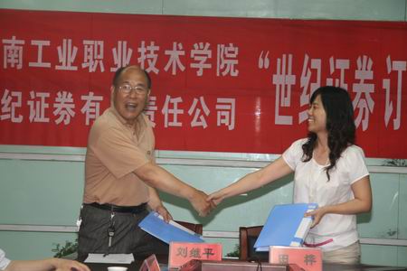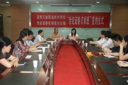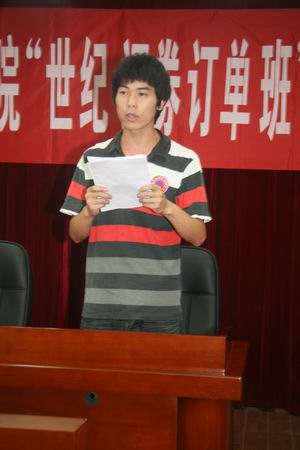 刘继平教授对世纪证券领导的到来表示热烈欢迎,对为合作办学付出艰辛劳动与汗水的工作人员表示衷心感谢。他说,我院坚持“以服务为宗旨,以就业为导向”的办学方针,不断调整专业设置,转变人才培养模式,面向市场,实施多种形式的联合办学,目前已开办了多个订单班,并得到合作单位好评。此次“世纪证券订单班”的开办标志着我院与世纪证券有限责任公司在合作办学方面迈出了关键的一步。他坚信,在双方的共同努力下,“世纪证券订单班”一定能取得圆满成功。