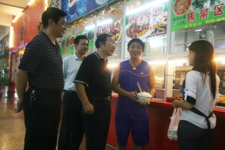 廖洪元一行视察了学生一食堂厨房、操作间、洗消间、售卖间等,并向食堂负责人详细了解了食堂各类食品及原料的定点采购情况、货物存储情况、及制作售卖各个环节,敦促食堂负责人一定要严格食品安全的质量控制,让同学们吃上放心菜。临近中午,廖洪元在售卖窗口和餐桌前亲切与就餐学生交谈,询问了学生对食堂菜肴质量、价格以及服务态度等方面的看法,认真听取了他们对yy漫画食堂工作的建议和意见。