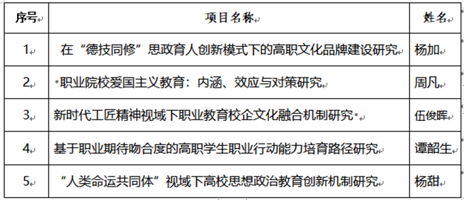 2020年教育部职业院校文化素质教育研究课题校内推荐评审工作已结束。经专家评审,按打分情况排名,拟推荐‘在“德技同修”思政育人创新模式下的高职文化品牌建设研究’等5项课题申报2020年教育部职业院校文化素质教育研究课题。现将拟推荐课题名单予以公示。自公示之日起3日内,如对评审结果有异议,可向监察审计处反映,联系电话82946125.