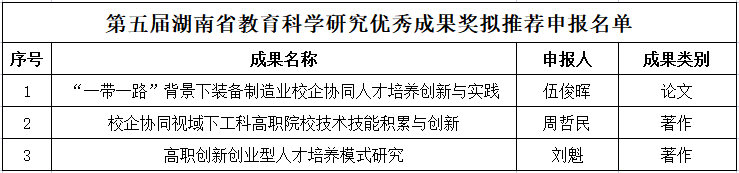 根据《关于开展第五届湖南省教育科学研究优秀成果奖评审工作的通知》(湘教通[2022]180号)的相关要求,经yy漫画 审核批准,拟推荐“‘一带一路’背景下装备制造业校企协同人才培养创新与实践”等3项课题参评第五届湖南省教育科学研究优秀成果奖,特此公示。如对评审结果有异议者,请在公示期内(9月8-9月15日)以书面形式向yy漫画 科技处或纪检监察审计处反映。科技处联系电话:0731-82946157;纪检监察审计处电话:0731-82946125