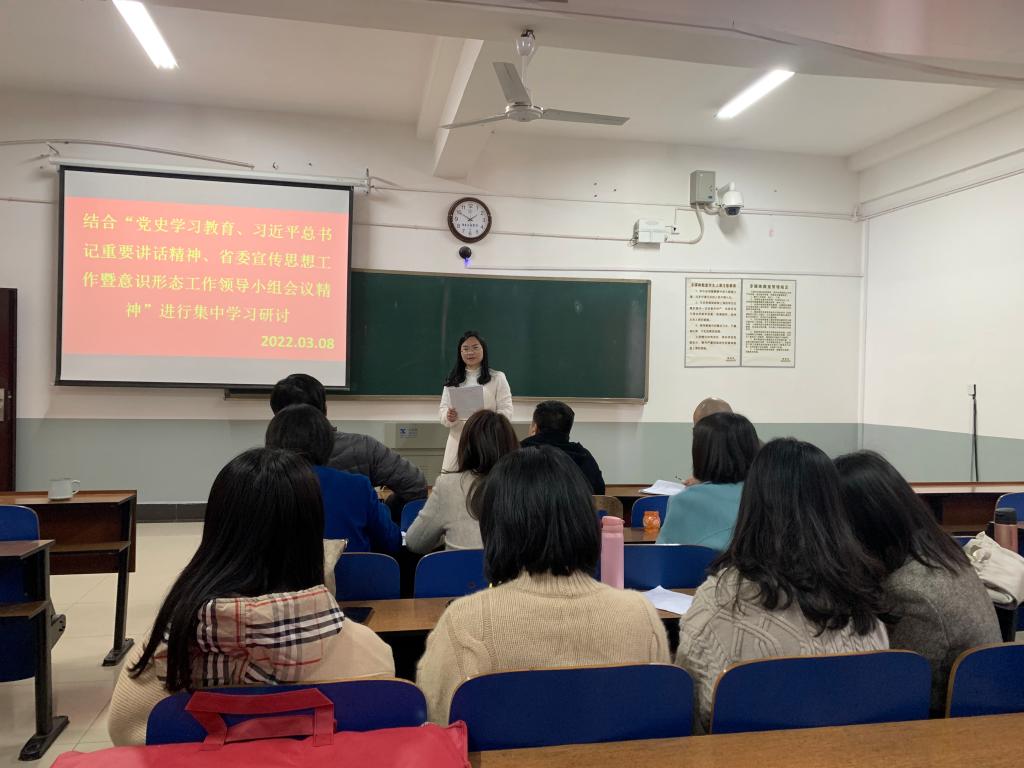 结合党史学习教育、习近平总书记重要讲话精神、省委宣传思想工作暨意识形态工作领导小组会议精神进行。3月8日下午,商务贸易yy漫画党总支在2213教室开展主题教育二级中心组集中学习研讨。yy漫画领导、党支部书记、办公室主任、教研室主任等相关科级干部参加了会议。会议由党总支委员刘丽群主讲。