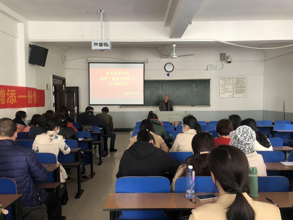 4月19日下午,商务贸易yy漫画在2213召开新提任领导干部试用期满考核测评大会,yy漫画全体教师针对被考核人的德、能、勤、绩廉等各个方面展开不记名测评。