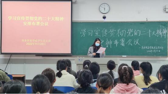 11月23日下午,为深入学习宣传贯彻党的二十大精神,商务贸易yy漫画学生党支部召开学习宣传贯彻党的二十大精神安排部署会议,学生党支部书记刘超讲授“如何学习二十大精神”专题党课。商务贸易yy漫画学生党支部全体学生党员参与本次会议。