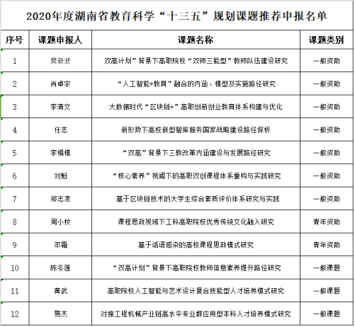 根据湖南省教育厅发布的《关于做好湖南省教育科学“十三五”规划2020年度课题组织申报工作的通知》(湘教通[2020]1号)的相关要求,经校外专家评审,yy漫画 审核批准,拟推荐我校“双高计划”背景下高职院校“双师三能型”教师队伍建设研究”等9项资助课题和““双高计划”背景下高职院校教师信息素养提升路径研究”等3项一般课题申报2020年湖南省教育科学“十三五”规划课题,特此公示。如对评审结果有异议者,请在公示期内(4月7-4月9日)向监察审计处反映,联系电话82946125。