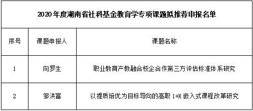 2020年度湖南省社科基金教育学专项课题校内推荐评审工作已结束。经个人申报与专家评审,拟推荐“职业教育产教融合校企合作第三方评估标准体系研究”与“以提质培优为目标导向的高职1+X嵌入式课程改革研究”等2项课题申报2020年度湖南省社科基金教育学专项课题。现将拟推荐课题名单予以公示。自公示之日起3日内,如对评审结果有异议,可向科技处反映,联系电话82946156。