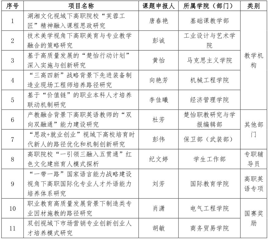 根据省教育厅《关于做好2022年湖南省职业院校教育教学改革研究项目申报工作的通知》和我校《关于申报2022年湖南省职业院校教育教学改革研究项目的通知》的通知要求,抽取校外专家对申报的44项项目进行评审,评审结果经yy漫画 审核批准,现将拟推荐项目公示如下: