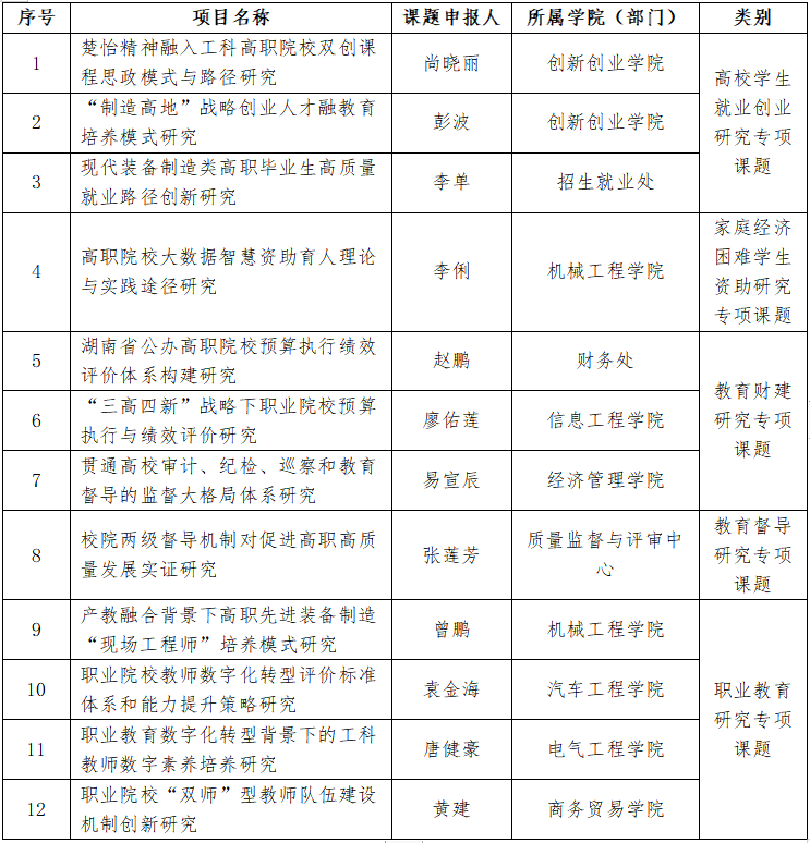 根据省教育厅《关于做好湖南省教育科学“十四五”规划2023年专项课题申报工作的通知》(湘教科规通[2023]1号)和我校《关于申报湖南省教育科学“十四五”规划2023年专项课题的通知》的通知要求,科技处共收到了41项课题申报书,经招生就业处、学生工作部、财务处、质量监督与评审中心审查,有4项申报书的申请人不满足申报条件。在剩余的37项中共有高校学生就业创业研究专项课题4项(拟推荐3项)、家庭经济困难学生资助研究专项课题1项(拟推荐1项)、教育财建研究专项课题3项(拟推荐3项)、教育督导研究专项课题1项(拟推荐1项)、职业教育研究专项课题28项(拟推荐4项)。