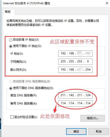 注意:必填项“首选DNS服务器”为:211.142.211.124,选填项“备选DNS服务器”为:114.114.114.114 。